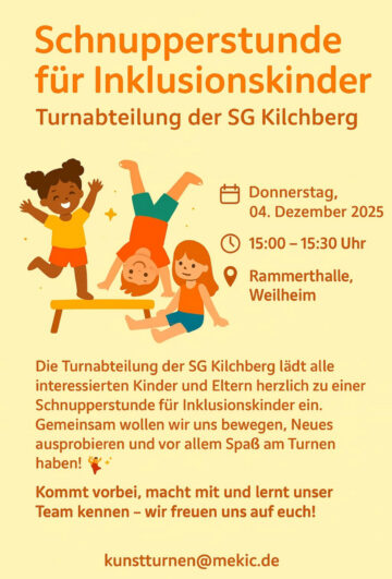 Die Turnabteilung der SG Kilchberg lädt alle interessierten Kinder und Eltern herzlich zu einer Schnupperstunde für Inklusionskinder ein. Gemeinsam wollen wir uns bewegen, Neues ausprobieren und vor allem Spaß am Turnen haben!